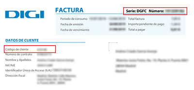 Tu código de cliente y el código de factura (SERIE + NÚMERO) aparecen en tus facturas de DIGI.